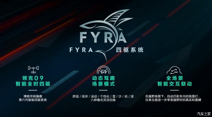 在发布会上,领克公布了领克09将搭载FYRA四驱系统,其拥有博格华纳瀚德第六代智能全时四驱,拥有八种场景模式(舒适、经济、运动、个性化、雪、沙、岩、泥),以及全场景智能交互联动(越野场景下,自动匹配车内氛围灯)。