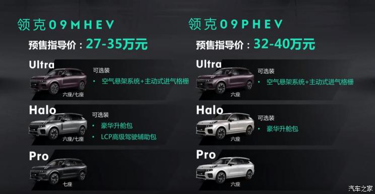 [本站 资讯]9月19日,领克旗舰车型领克09正式下线,发布会上还公布了领克09的预售价格,其中领克09 MHEV车型前期推出3款车型,预售价格27-35万元;领克09 PHEV车型前期也推出3款车型,预售价区间为32-40万元。需要注意的是,以上预售价格是包含选装件后的价格。新车基于SPA架构打造的中大型SUV,提供6座与7座版本。新车将会在2021年10月9日开启预订,并在10月份正式上市。