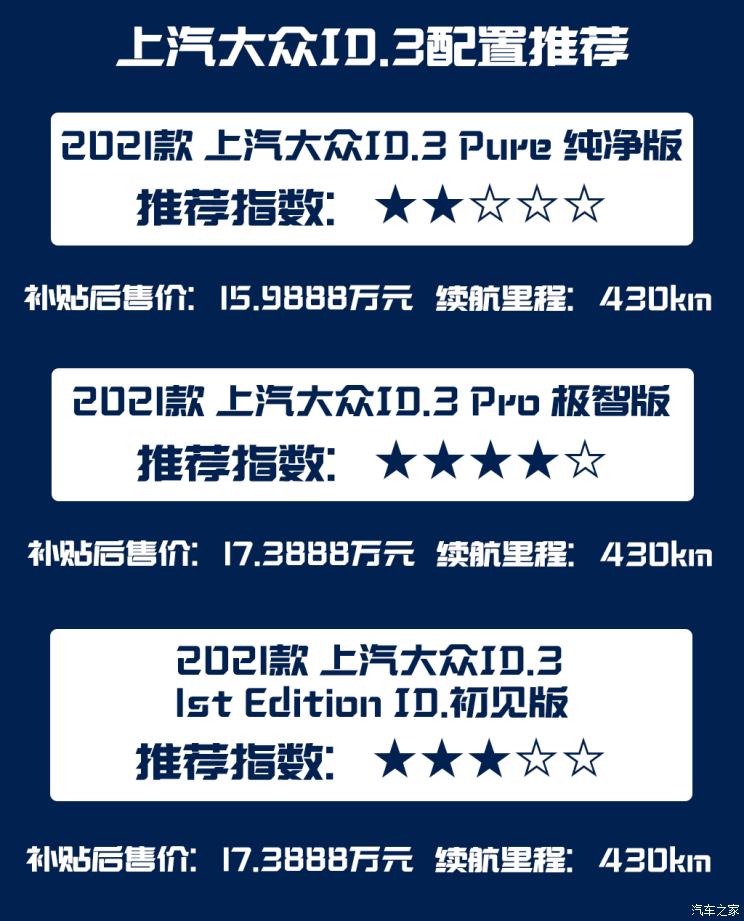 此次ID.3只推出了三款配置车型,全系车型动力相同,且全系车型均配备容量为57.3kWh的电池组,NEDC续航里程为430km;所以选哪款车型非常好决定,你只需要考虑配置因素就够了。