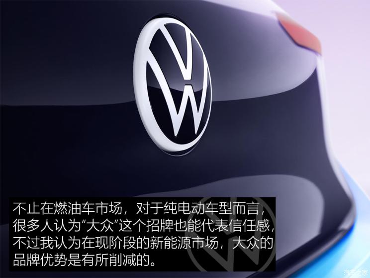 营销中往往说到,熟悉代表信任,这在大众这款车上也是同理。大众深耕市场几十年,给消费者留下了很深印象,也拥有足够多的用户口碑,相比刚冒出来没两年的新势力品牌而言,“大众”这个招牌确实更容易让人信任;但因为大众在新能源领域并没有给中国消费者留下深刻印象,所以对于一款纯电动车型而言,“大众”这个牌子可能没有在燃油车上那么好使了。