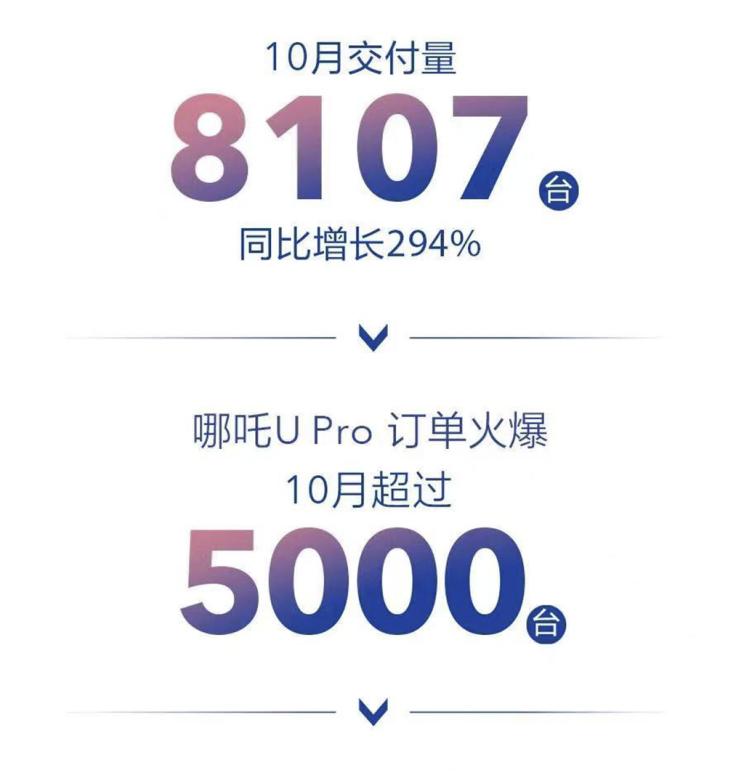 [本站 新能源] 日前,哪吒汽车官方公布了其10月份的交付量,共8107台车,同比增长294%,连续9个月打破交付记录,2021年1-10月累计交付量为49534台,同比增长398%,哪吒汽车累计交付量达到了75837台。