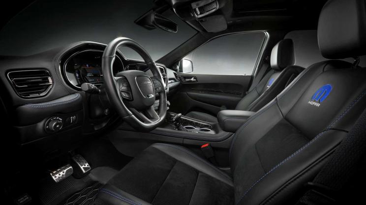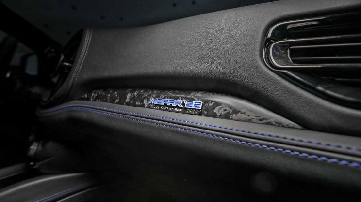 内饰部分,新车将会在细节处融入诸多Mopar设计元素,比如,一款采用蓝色缝线设计并运用Alcantara材质进行打造的座椅将会出现在新车之上;同时,新车将会在副驾驶前方配备特别版车型的专属徽标,Mopar’22徽标下方还将配备专属的车身编号。