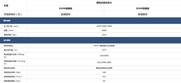 新款缤越PHEV会提供85km星耀版和85km荣耀版两个纯电续航配置版本,新车的配置相比于老款会有所调整。动力部分依旧采用170马力(130kW)、255牛・米的1.5T发动机,系统综合功率为190kW,峰值扭矩为415牛・米。不过相比老款车型,新车的纯电续航里程从此前的62km升级到85km。