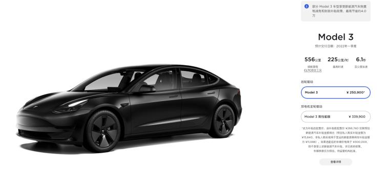 [本站 新车上市] 日前,我们从特斯拉(中国)官网获悉,Model 3推出了一款后轮驱动版本,补贴后售价25.09万元(指导价26.674万元)。此外,新车预计2022年一季度开启交付。