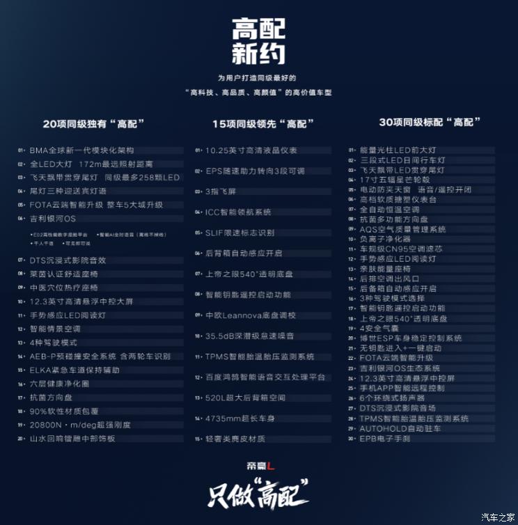同时,新车将全系标配FOTA云端智能升级。与传统意义上的软件更新不同,FOTA升级的覆盖范围包括动力域、底盘域、车身域、ADAS域、信息娱乐域等五大板块。在人机智能交互上的表现,帝豪L配备了吉利银河OS生态系统,尤其是语音交互方面,智能AI全时语音、可见即可说。以智能AI全时语音为例,即便在没有信号的条件下,也可以正常使用多功能的人机交互。此外,帝豪L车机芯片采用了12nm制程工艺,让其车机硬件配置在CPU算力、GPU算力、内存性能等方面均有着更为出色的表现。 当然,在日常用车便利性上,帝豪L配备了540°透明底盘、三指飞屏、12.3英寸高清悬浮中控屏,百度在线导航、多媒体娱乐系统、App智能远程控制、语音控制、ELKA的紧急车道保持以及AEB-P的两轮车识别功能。
