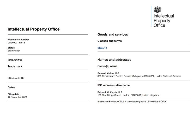 [本站 新能源] 日前,据外媒曝光,凯迪拉克在美国专利商标局注册了四个商标,它们分别是Celestiq、Escalade IQL、Vistiq以及Lumistiq。其中Celestiq这个名字想必大家并不陌生,该车在今年初曝光,采用纯电驱动,定位中大型纯电旗舰车型,将于2024年亮相。
