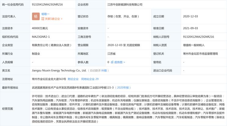 Niutron造车项目立项于2018年11月,品牌总部位于北京,上海设立研发中心,研发及智能制造基地位于常州,目前公司核心研发团队接近1000人,均来自于国内外主流一线汽车公司,平均工作年限10年以上。2020年12月,江苏牛创新能源科技有限公司完成注册登记,注册资本5000万美元,该公司为台港澳法人独资的外资企业。到了2021年该公司迁移到常州金坛,注册资金从一开始的5000万美元增到40000万美元。