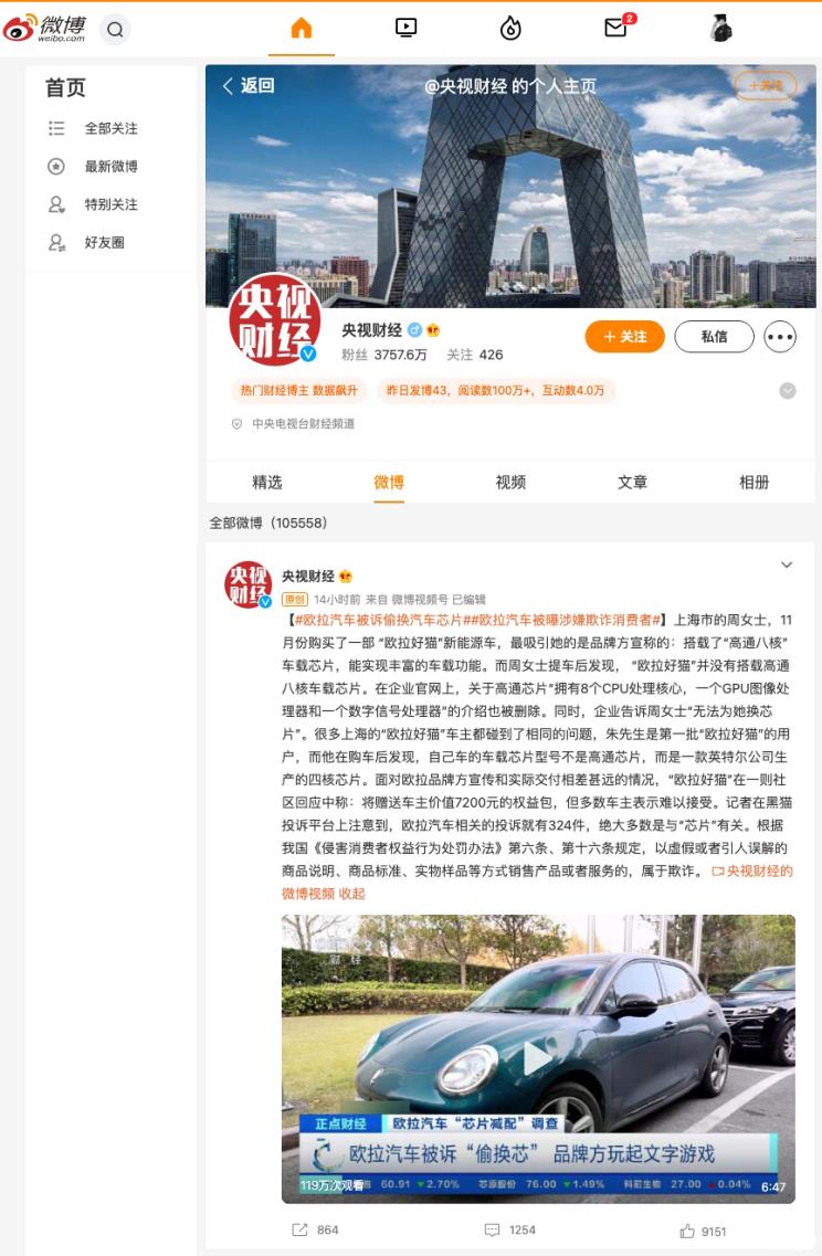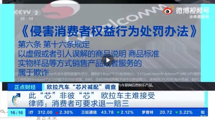 [本站 资讯] 欧拉好猫车机系统芯片与宣传不符事件被广大用户关注,而近日中央电视台财经频道针对此事进行报道。其中有位受访的上海车主朱先生表示,官方App在不久前进行了一次强制升级,升级后原外显的高通芯片信息进行清除。
