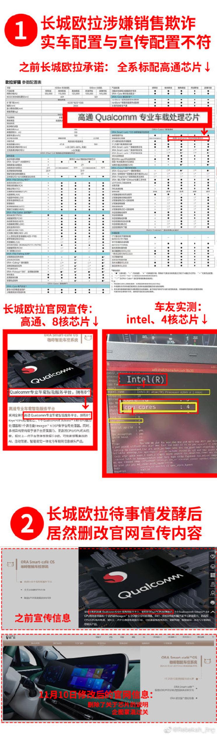 为何车主们的反应如此强烈?让我们回顾最初事件的发展。不久前,有不少欧拉好猫车主反应其购买车辆所搭载的是英特尔Intel Atom A3940四核处理器芯片,并非此前官方网站中宣传图片描述的是高通Qualcomm8核中央处理器芯片。不仅如此,其欧拉好猫车机系统的GPU模块采用的是英特尔Intel Atom A3940配套HD500系列GPU芯片,也并非官方所描述的高通Qualcomm Adreno 640 GPU芯片,一场“狸猫换太子”的操作,引起车主们的强烈不满。