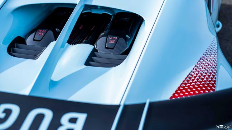 外观上,新车与普通版Chiron Pur Sport的整体设计相同,依旧采用经典的马蹄形前进气格栅搭配前包围两侧大尺寸的通风/散热开口,以及车头两侧极富特色的LED灯组,展现出了非常浓郁的运动气息。此外,车身颜色取自Type 51赛车上的原色,并搭配了由众多“EB”LOGO组成的红色车身拉花,其细节看上去令人惊叹。
