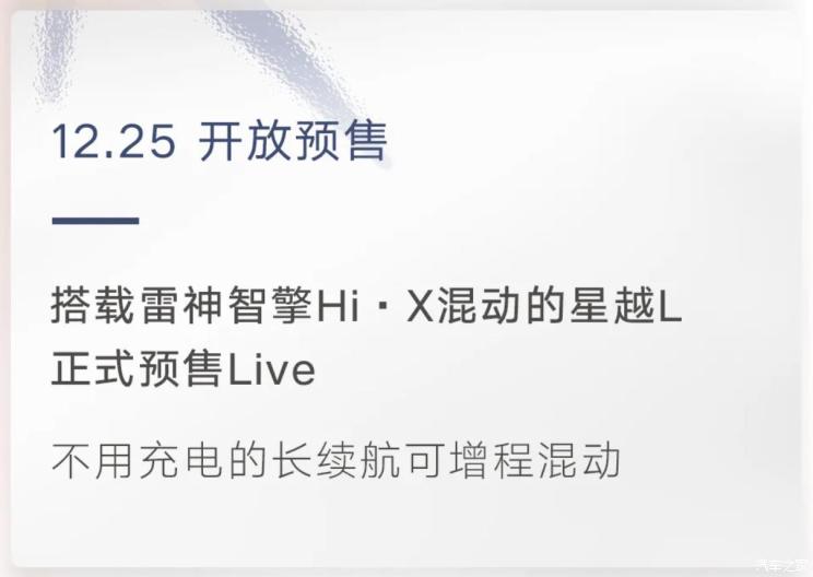 [本站 资讯]日前,我们从官方获悉,吉利星越L油电混动版将于12月25日开启预售。新车是星越L的新增动力车型,匹配吉利3挡混动电驱DHT Pro变速箱。根据此前信息,新车将在预售时公布售价,并在后期上市。