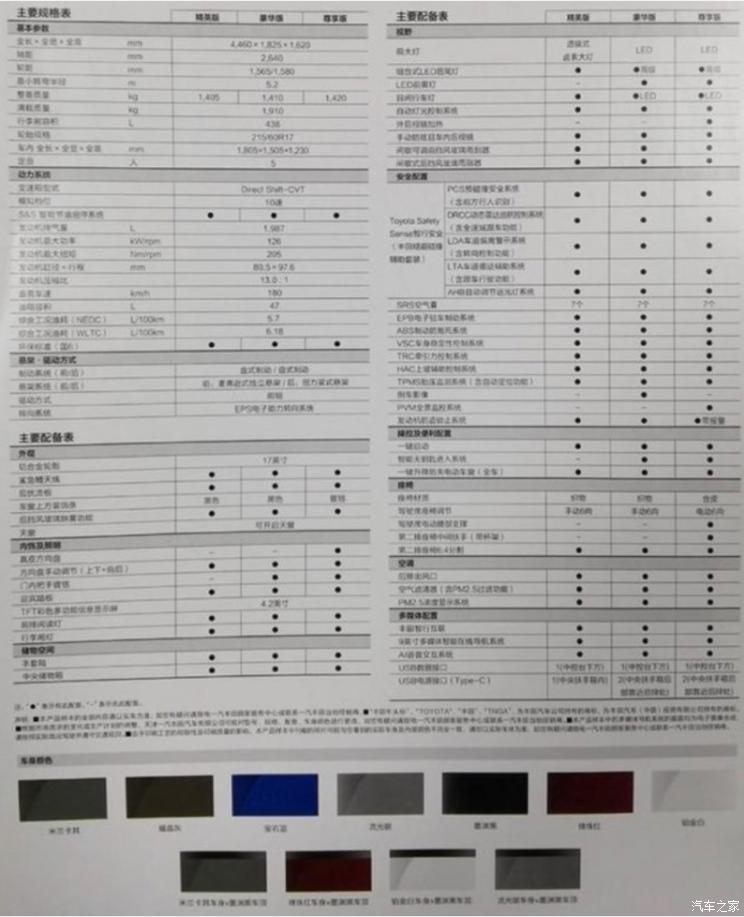 结合此前获取到的配置表来看,新车预计将会推出三款车型供消费者选择,全系车型配备LED日行灯,入门版车型大灯采用卤素光源,中配和高配车型则配备LED光源大灯。另外,新车标配17英寸轮圈以及电动天窗。车身颜色方面,新车提供7种纯色以及4种拼色供消费者选择。此外,9英寸中控屏为全系标配,同样全系配备还有丰田智行互联、TSS智行安全系统以及7个安全气囊等等,新车还将全系配备机械式仪表盘,中央搭载4.2英寸液晶显示屏。另外顶配车型还拥有真皮方向盘、真皮座椅、电动调节前排座椅以及360°全景影像等等。