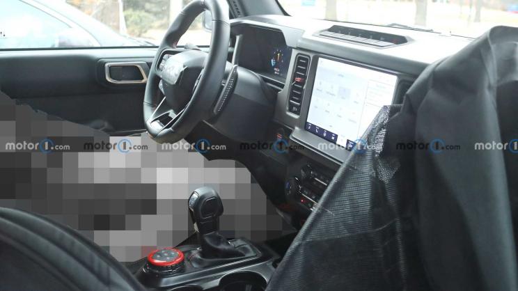 内饰方面,新车与普通版Bronco相比在整体设计方面没有太大区别,依旧是配备全液晶仪表盘、带换挡拨片的三辐式多功能方向,并搭配了内嵌在中控台中央的大尺寸多媒体显示屏,中控下方还保留了大量的物理按键,换挡杆依旧为机械式设计,其后方还有一个带红色装饰越野模式选择旋钮。