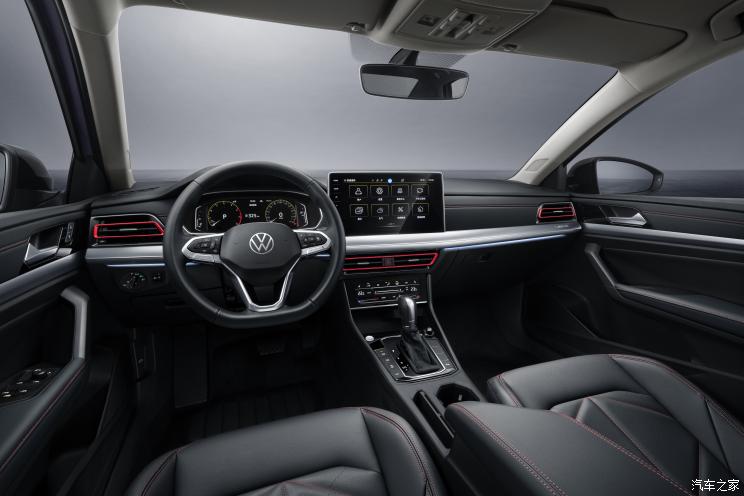 内饰方面,中控屏由原来的嵌入式改为大众品牌最新的悬浮式设计,提升座舱科技感。横向双色饰板贯穿整个仪表台,视觉上将中控台分割为上下两部分,彰显内饰层次感。全新的家族式方向盘,空调出风口、仪表盘、门板等处,均采用炫银质感的镀铬加以修饰。此外,酷感黑则为运动版车型独有的配色方案,采用大面积石墨黑色皮革面料,并在空调出风口,座椅缝线和扶手处使用红色作为点缀。