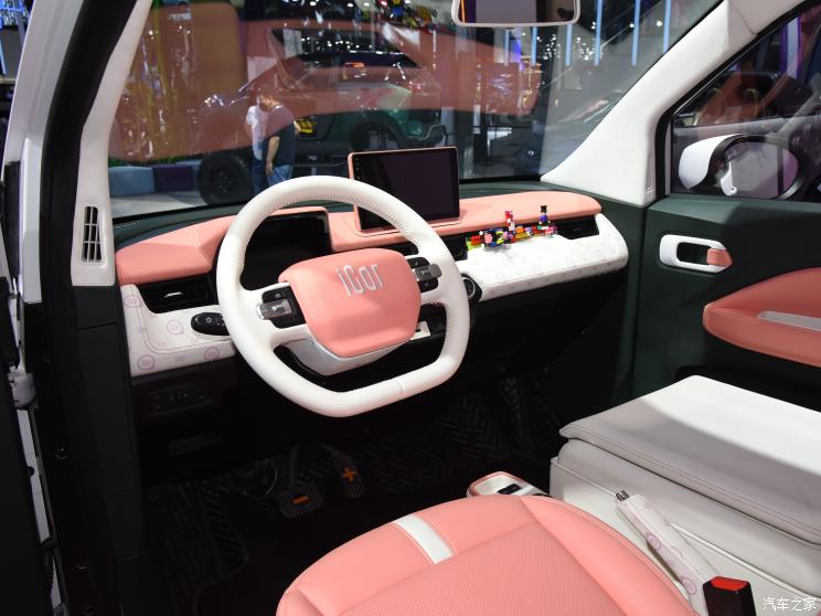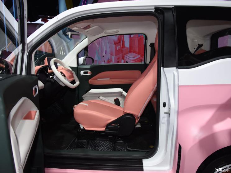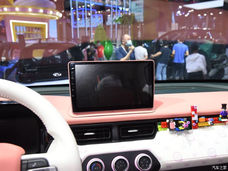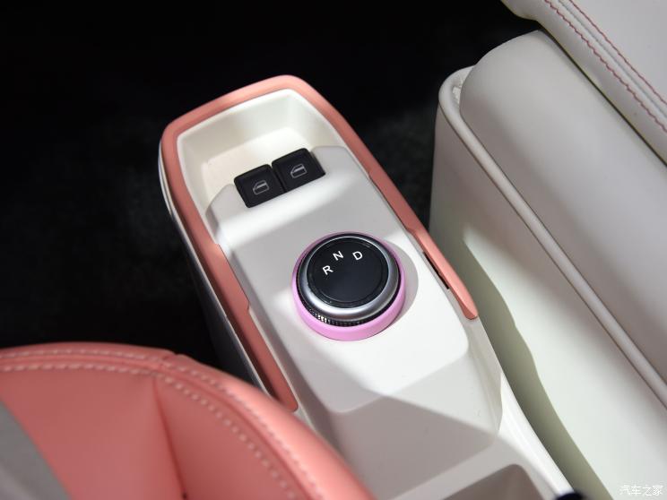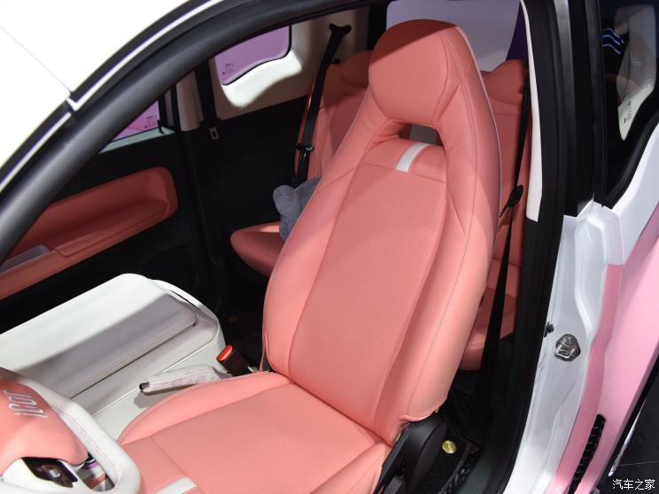 内饰方面,车内同样是粉色与白色相间的设计,副驾驶仪表台增加了一些积木的卡通设计,个性化十足,虽然车小,但中控屏的尺寸并不算小,这一点比QQ冰淇淋看上去更高级。副驾驶是“女王脚踏”,后排乘客可以把腿放在这个小凳上。这使得车内空间一下变得更宽大。座椅布局上,前排1个座椅,后排2个座椅布局。