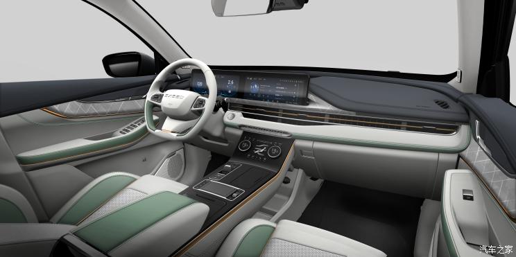 内饰主打浅绿色,并运用大量的电镀和INS膜片装饰,看起来颇为时尚,也更讨女性喜爱。座椅采用浅绿和浅灰拼色设计,并运用了精致的绗缝刺绣工艺,结合有机形态交织曲线,让质感更突出。