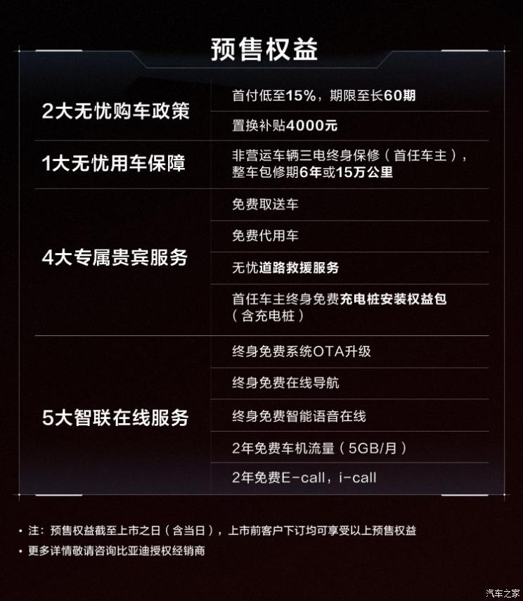 [本站 资讯] 2022年3月19日,比亚迪超混旗舰轿车汉DM系列正式开启预售,预售价格区间为21.68-32.28万元,其中汉DM-i的预售价21.68-29.28万元、汉DM-p的预售价32.28万元。同时,消费者还可以享受金融政策、用车保障等预售权益,具体见下图。