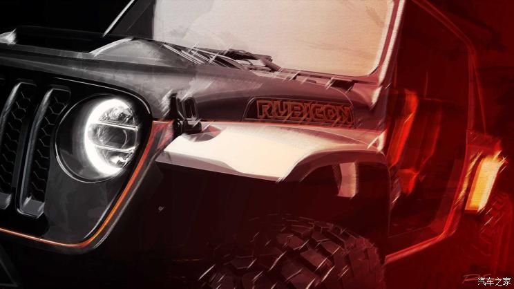从预告图上看,新车外观车漆是带有一些军事风格的涂装,整个车漆采用了橄榄绿色,发动机盖侧面的“RU31-Con”字样是一种艺术化的“Rubicon”拼写方式。另外,我们还可以看见非常厚实轮胎花纹以及较为复古的轮圈样式,前侧翼子板下方还标有一个美国国旗,整体风格很容易让人联想起以前的威利斯车型。