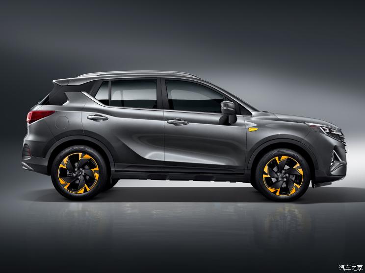 来到侧面,可以看到新车的轮圈以及翼子板处都采用了黄色来进行装饰,搭配皓月灰色车身形成的撞色设计,十分醒目。车身尺寸方面,新车保持不变,长宽高依旧为4350/1825/1660(1685含行李架)mm,轴距为2560mm。