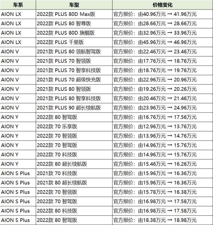 [本站 资讯]日前,我们从广汽埃安官方获悉,针对旗下在售产品,将从4月7日起进行售价调整。根据不同车型,新车整体涨幅在6000-10000元,不过也有部分车型并未涨价甚至有所降价,具体信息请看下表:
