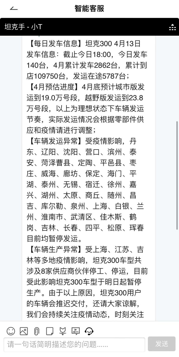 [本站 资讯] 日前,我们从官方获悉,坦克300在4月14日起暂停生产。此次停产的原因是受上海、江苏、吉林等多地疫情影响,其8家供应商停工、停运。此次停产,将会导致坦克300用户的车辆推迟交付。本站对此咨询了官方人员,对方表示,具体时间待定。