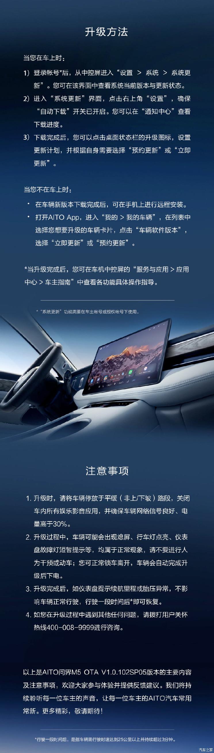 [本站 资讯] 日前,我们从AITO官方微博处了解到,旗下中型SUV――问界M5从4月15日,为用户陆续推送首次OTA升级。本次升级版本为V1.0.102SP05,主要设计内容包括主驾座椅迎宾、灯光提示、智慧语音、大屏UI界面、转向灯提示音等多项优化,升级预计用时2个小时,升级优化的功能、方法以及注意事项,具体升级内容如下: