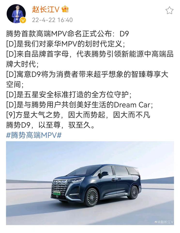 [本站 新能源] 2022年4月22日,腾势MPV正式公布命名为D9。腾势D9定位为中大型MPV,此前该车已公布外观官图,网上也有其内饰谍照流传。官方透露,该车预计将于近期上市。