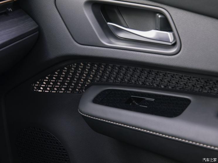 内饰设计上,黑色仍为主色调,金色的装饰勾边,展现出一种高级感。空调出风口的金色装饰条贯穿整个内饰,整个内饰看上去干净整洁,中控台上方是皮革面料,并有缝线装饰,而空调出风口下方的面板则是木纹装饰,看上去很有居家的风格。这一木纹装饰还延展到变速箱排挡周围,以及后空调出风口处。同时,车门上和中控台下方,你还能看到前格栅内不规则模块类似的装饰设计。