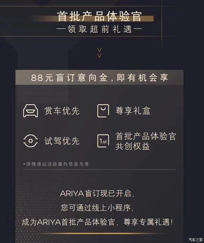 [本站 资讯]4月27日,东风日产Ariya开启盲订,将开启东风日产电动车新时代,新车诞生于雷诺-日产-三菱联盟全新电动汽车平台CMF-EV,它会使车内的地板更平坦,让后排乘客有更舒适的腿部空间。新车尺寸与奇骏接近,定位为紧凑型SUV。新车将由7种外观配色可选,交付88元盲订意向金,即可享受尊享礼盒、首批产品体验官共创权益等。