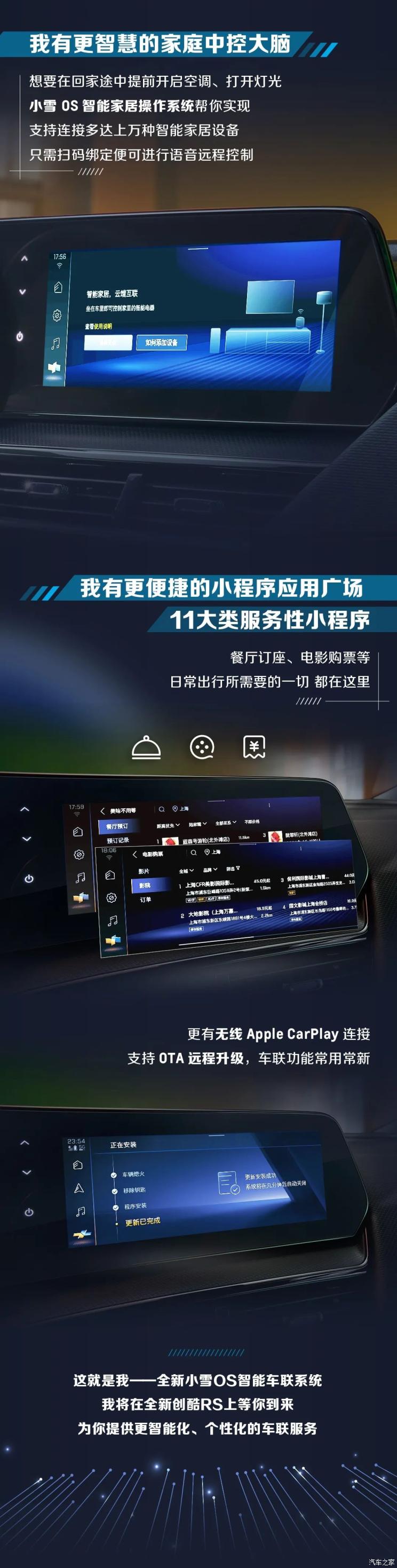 [本站 资讯] 日前,我们从官方获悉,雪佛兰创酷RS将搭载小雪OS智能车联系统,同时也是该品牌首款搭载这一系统的车型。该系统针对智能导航、人机交互以及车载多媒体等功能进行提升,支持OTA升级。