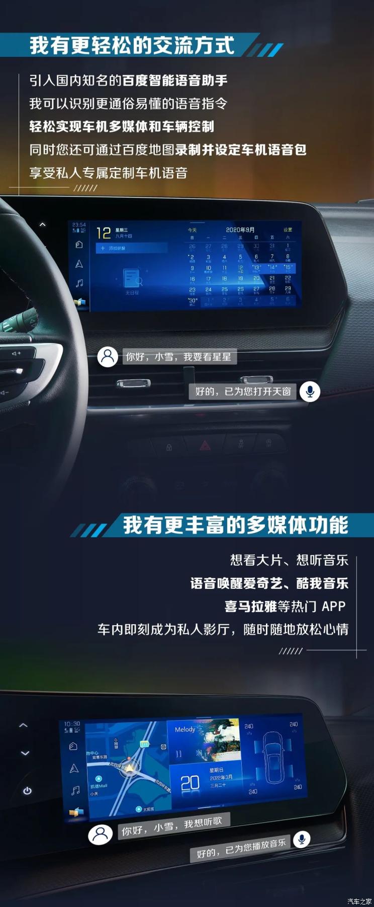 在语音交互方面,全新小雪OS智能车联系统引入国内知名的百度智能语音助手,通过“你好,小雪”或自定义唤醒词即可唤醒车机,用通俗易懂的交流方式就能轻松指挥内置小程序与APP,实现车机多媒体和车辆控制,如发出“我有点热”、“我要看星星”等语音指令,便可自动开启空调、打开天窗。此外,用户还可通过百度地图录制并设定车机语音包,享受私人定制车机语音。