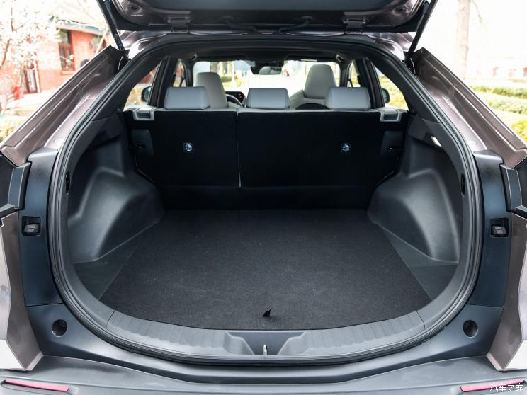 车身侧面,两个黑色的轮眉格外醒目,突显了跨界车的设计,车辆的快慢充电接口位于左右前翼子板上,与很多车的充电接口位置都有明显不同。A柱看上去十分纤细,再加上三角窗的设计,使得驾驶员转向会有良好的视野。车尾不同于不同SUV,有点类似轿跑SUV的设计,C柱的倾角非常大。车身尺寸方面,新车长宽高分别为4690/1860/1650mm,轴距为2850mm。