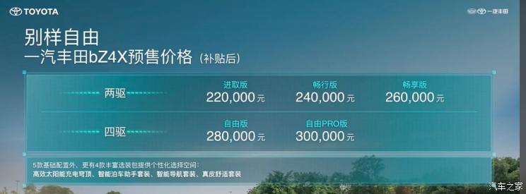 [本站 资讯]4月28日,一汽丰田bZ4X正式公布预售价,新车推出5款车型,新车预售价格为22-30万元,前驱车型CLTC工况综合续航615km,四驱车型CLTC工况综合续航560km。新车定位为纯电中型SUV,轴距与汉兰达相同,同为2850mm,车长仅比RAV4荣放稍长。新车基于丰田e-TNGA专属架构打造,到2025年丰田bZ系列家族将在中国推出5款新车。