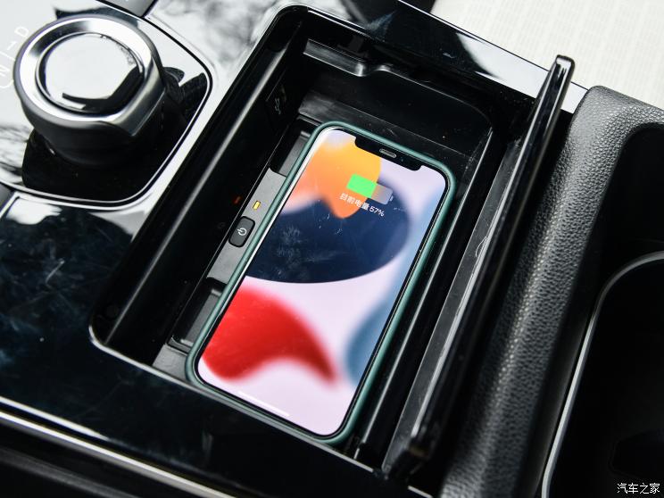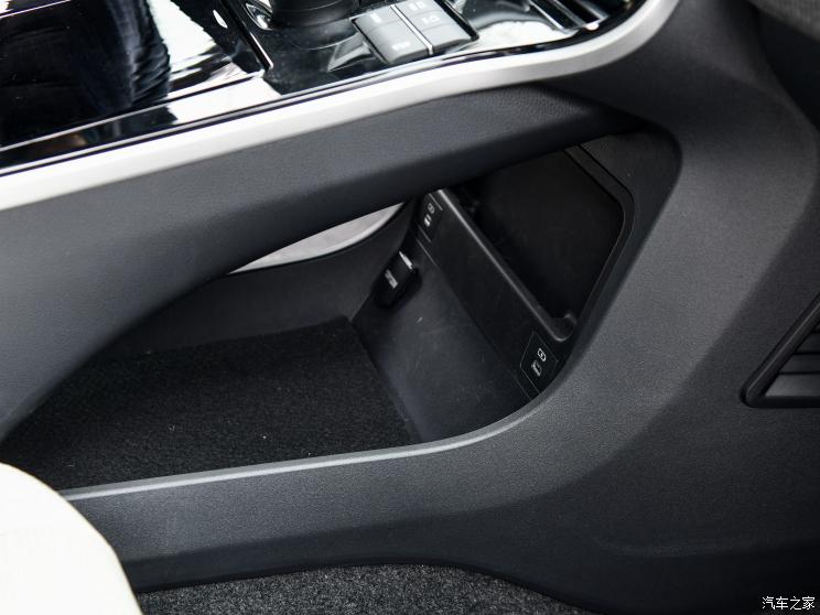 在屏幕下方,继承了触摸式按键和部分空调控制物理按键,车内包括座椅加热、方向盘加热、PM2.5过滤等丰富的配置。在空调出风口下方,与之相连的是变速器排挡区域,新车采用电子旋钮式排挡,两侧则是驾驶相关的按键,包括电子手刹、AUTOHOLD、驾驶模式、全景影像等按键。在排挡后方还有一个无线电充电板。中控台面下方,还有一个巨大的储物空间,并提供了充电接口和12V电源。前排中央扶手宽大,并可以前后移动。