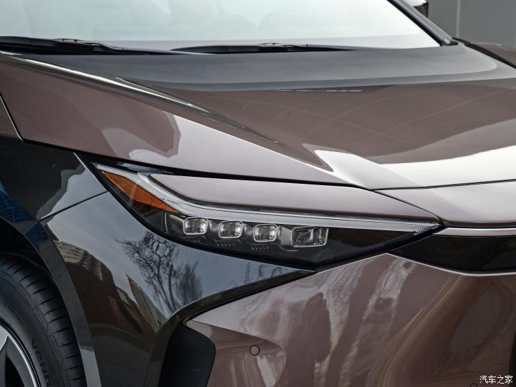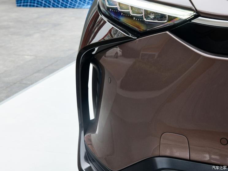 外观方面,丰田bZ4X采用垂头鲨外观设计,前脸看上去极为运动,杀气十足。前大灯由多个透镜组成,上方的LED日间行车灯与前格栅的镀铬贯穿相连。整个前脸使用了两种颜色,黑色装饰部分包括前格栅、下进气口和两侧的进气口。两侧大尺寸的进气口将会降低新车的风阻系数。前大灯灯眉好似一个独立的存在,更像是眼睛的眉毛,赋予了新车生机。