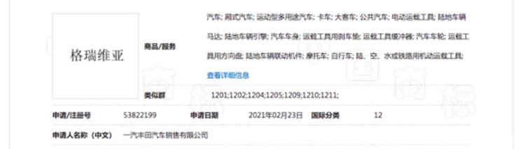 [本站 资讯]日前,我们从相关渠道获悉,一汽丰田Granvia有望最快在本月发布,或下半年上市,从其注册商标来看,新车中文名可能定名为格瑞维亚,其为广汽丰田赛那SIENNA的姊妹车型,定位中大型MPV。