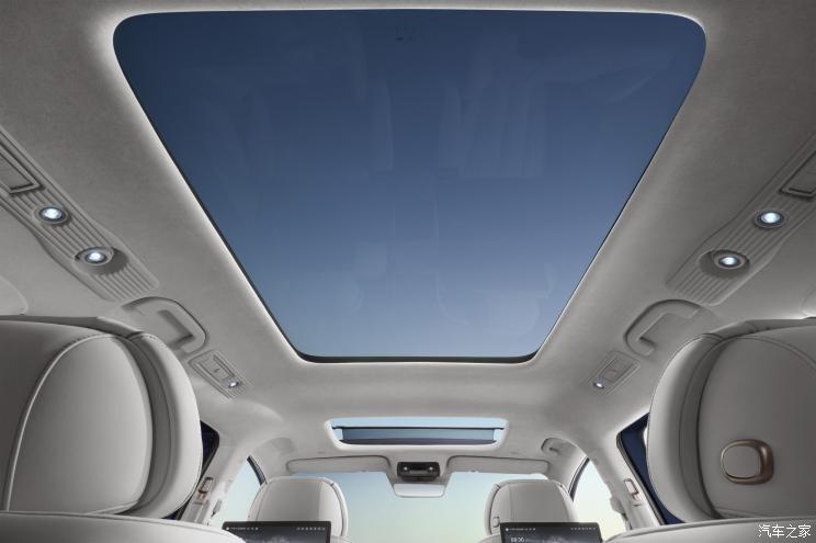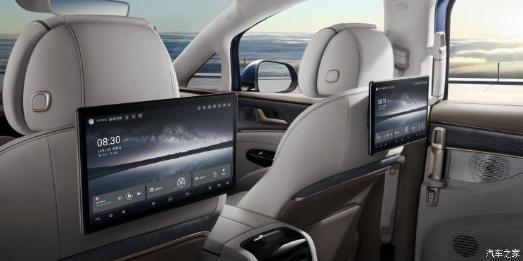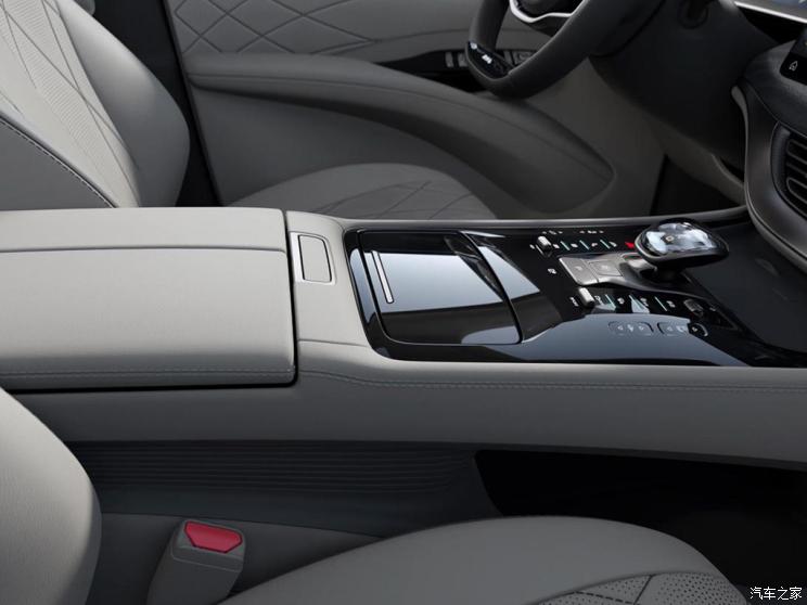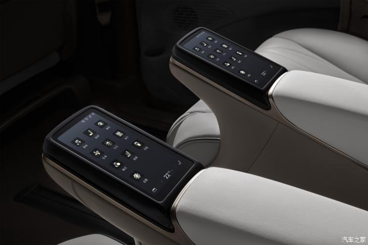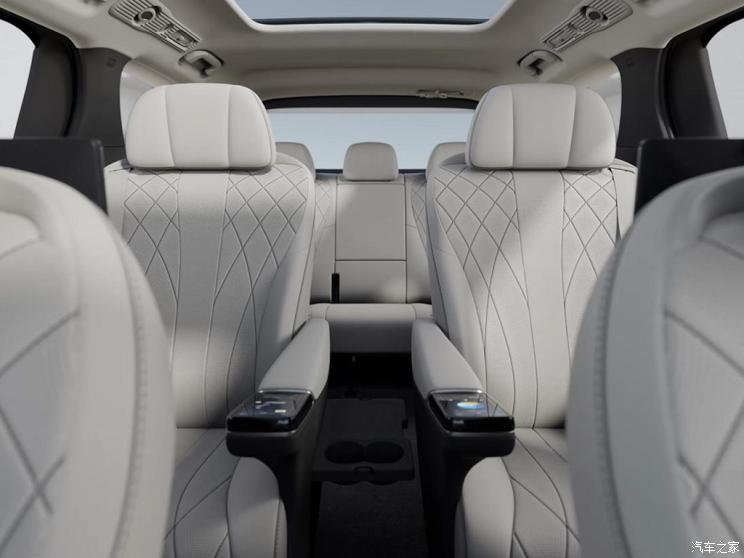 来到第二排,车内有着两个相对独立的豪华座椅,皮革座椅不仅有菱形的纹路,还有很好包裹性的头枕。每个座椅扶手上,都有独立的控制区域,由一块液晶屏组成,可以控制电动座椅的调节与按摩,同时还能控制多媒体系统。第二排每个座椅前还有独立的多媒体系统,也可以控制空调系统,播放娱乐节目,同时还有独立的摄像头可进行电话会议。同时,前排座椅后部也会营造出漂亮的氛围灯效果。后排两个座椅中央,也提供了两层的储物盒,虽然储物空间不大,但也能满足一定需求。