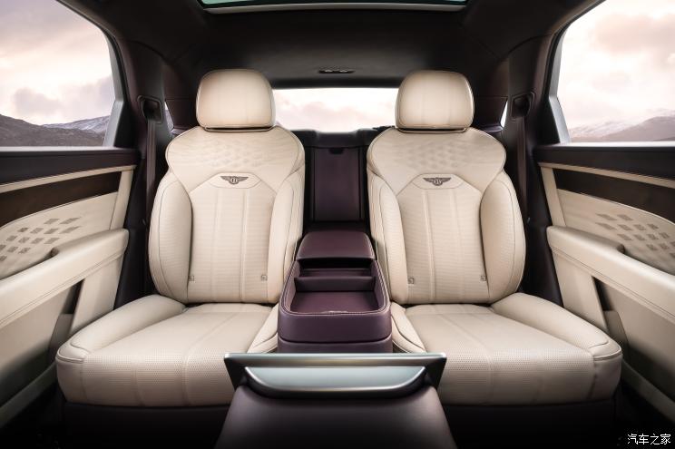 内饰方面,添越长轴距版的后排将拥有三种座椅配置可选,包括全新4+1(5座)、4座以及传统5座布局,并提供航空级座椅套件,具备22向可调节功能,拥有全球首创的自动温度感应和舒逸按摩功能。4座舒适座椅配置包含一款位于后排座椅之间的中控台,提供额外的储物空间和两个USB充电接口。此外,Mulliner部门还为新车设计了集成式冷却装置可选,该冷却装置含一支750毫升的容器,以及一对手工打造的坎布里亚水晶杯。