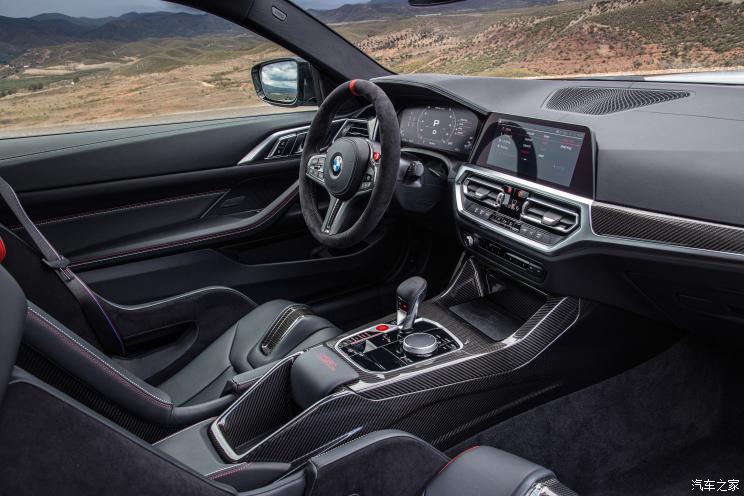 内饰部分,新车并未采用搭载最新的iDrive 8车机系统的双联屏,它依旧是现款车型的全液晶仪表盘+悬浮式设计的中控多媒体显示屏。有变化的地方是,新车采用了Alcantara+碳纤维材质组成的三辐式多功能运动方向盘,并且中控功能面板区域采用了大量碳纤维装饰,并且取消了水杯架改为了无线充电面板;而后方的中央扶手区域也被取消,仅留下一个内凹的储物空间,但镶嵌了一个“CSL”的LOGO,时刻提示着新车身份。此外,新车的座椅是标配的一体式碳纤维运动桶椅,并且取消了后座(后部留下了可以存放两个头盔的储物槽),整体下来,其减重效果不言而喻。