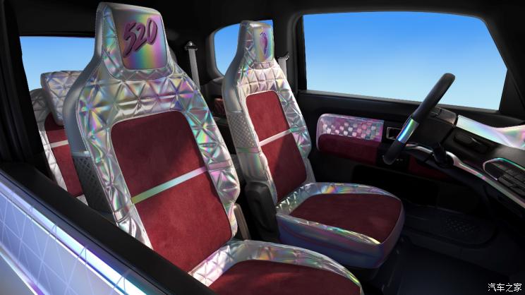 内饰设计与外观保持一致,同样加入了大量的镭射元素和毛绒材质,座椅和门板均采用镭射皮革与翻毛皮包覆,提升视觉感受。同时,该车车顶还采用了点阵式氛围灯,可呈现流星划过的视觉效果,营造不错的驾乘氛围。
