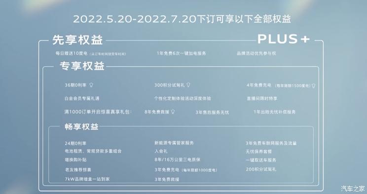 依据购车时间的不同,官方还提供了4种购车权益。今年12月31日前购车的用户可享受14项畅享权益,包含24期0利率购车、免费充电盒及安装、3年免费救援、3年免费车联网服务及流量、8年或者16万公里三电质保等。10月1日前下定的用户,可升级至36期0息金融产、8年免费救援、3年免费售后保养服务包等。7月21日前下订的用户,再额外赠送从订车到交车期间每日10度电、一年6次免费一键加电服务、品牌专属活动权益。而5月20日24点前订购的用户,还享受36期低首付、低月供、低利率且高保值的专属金融方案。