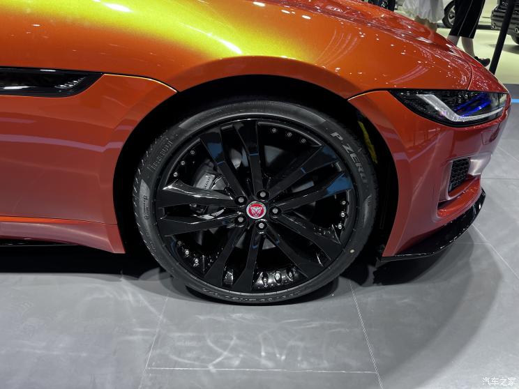 车身侧面,新车硬顶版的车顶线条依旧非常优美顺滑,侧面整体没有采用过多的筋线刻画,车门下方内凹式的设计让该车拥有一定的肌肉感,再配合密条辐大尺寸轮圈与彩色的制动卡钳相搭配,细节上更能凸显F-TYPE的优雅。