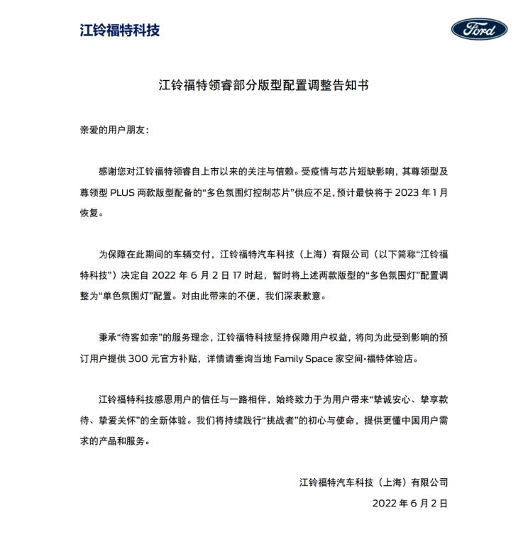 为保障在此期间的车辆交付,江铃福特汽车科技(上海)有限公司(以下简称“江铃福特科技”)决定自2022年6月2日17时起,暂时将上述两款版型的“多色氛围灯”配置调整为“单色氛围灯”配置。对由此带来的不便,我们深表歉意。