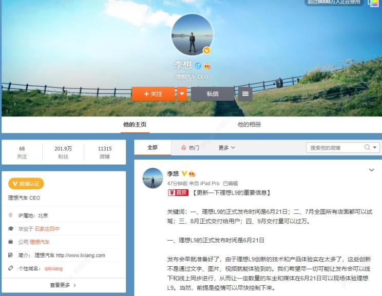 [本站 资讯] 6月4日,理想汽车创始人李想在其个人微博发布信息,公布了理想L9的首发、试驾和交付等时间,其中新车将于6月21日正式发布,并在9月交付量可以过万。