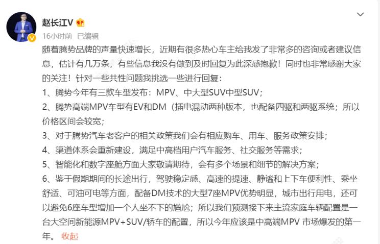 根据此前信息来看,腾势今年将推出三款新车,除了已经发布的“2.0时代”的全新产品――腾势D9(预售价33.5-66万元),还有两款SUV,分别定位中型SUV和中大型SUV。关于新车更多消息,我们也将持续关注 。
