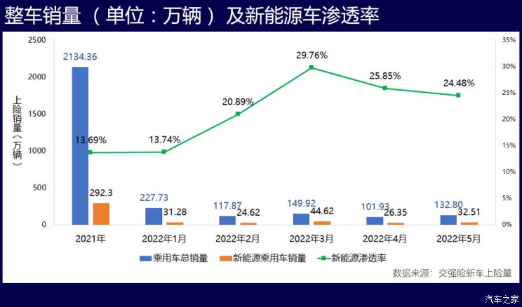 通过上险量来看,2021年全年共销售了2134.36辆新车,其中新能源车型销售了292.3万辆,渗透率为13.69%。然而来到2022年,新能源车型的渗透率很快便突破了20%的大关,并稳定在了25%左右的水平。这个数据还是只统计纯电动与插电式混动车型得出来的成绩,如果算上混合动力车型的话,将会突破30%。也就是说,有将近1/3的消费者在购买新车时更倾向于电动化产品,纯燃油车市场正在被不断侵蚀。