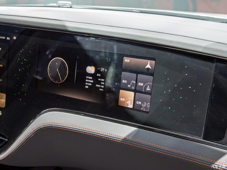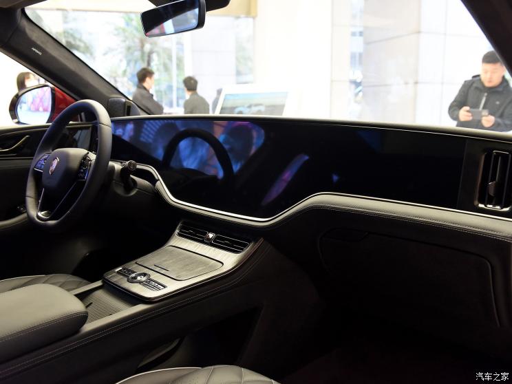 内饰方面,有两种内饰颜色可选,分别是纯黑色和蓝米色相间。车内使用了一个贯穿连屏的设计,其实际由10.25寸仪表盘、14.6寸中控屏和10.25寸副驾屏组成,其中,中控屏的尺寸最大,整个中控连屏采用T型的设计。三联屏源于高通第三代骁龙数字座舱平台,搭载了5G通讯、高精地图、百度生态系统、屏内虚拟助手、智能语音交互、手势交互(未来OTA升级拥有手势控制)等功能,导航将具备AR增强现实功能。人脸识别可监控驾驶员表情,并根据表情做出相应的功能提醒,比如监测到驾驶员疲劳时做出警示,手机App可以远程控制汽车。