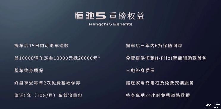 购车享受以下10项权益,提车后15日内可退车退款,提车后三年内6折保值回购,首10000辆车定金10000元抵20000元,免费提供恒驰H-Pilot智能辅助驾驶包,整车终身质保,三电终身质保,终身享受每年2次免费基础保养,赠送家用充电桩及免费安装服务,赠送5年(10G/月)车载流量包,终身享受24小时免费道路救援。