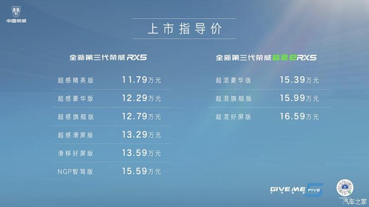 [本站 新车上市] 8月5日,全新荣威RX5/eRX5车型正式上市。其中全新荣威RX5共有6款车型,售价区间为11.79-15.59万元;全新荣威eRX5拥有3款车型,售价区间为15.39-16.59万元。