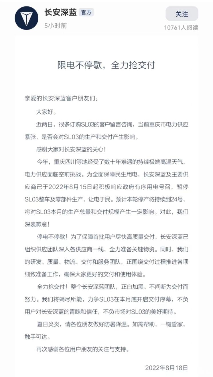 [本站 资讯] 近日,长安深蓝官方称,因重庆四川等地经受了数十年难遇的持续极端高温天气,目前城市正常生活电力供应紧张,为全面保障民生用电,长安深蓝及主要供应商已于2022年8月15日起积极响应政府有序用电号召,暂停SL03整车及零部件生产。